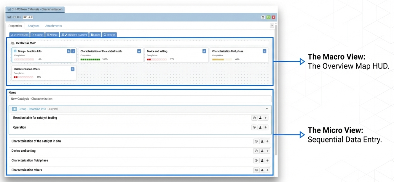 Imagine you are filling out a “New Catalysis - Characterization” report. The Overview Map helps you track multiple sections simultaneously.